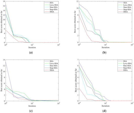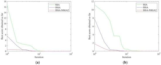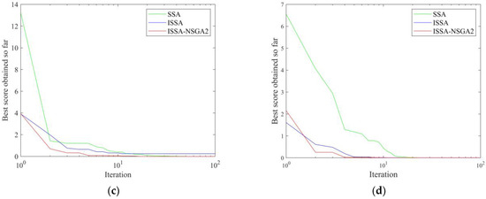 The performance of the algorithms was tested under the same parameters, iterations, and test environment. Because the initial value was randomly selected, the results of each algorithm at the first iteration are different. Specifically, thanks to the more homogenous initial distribution of the population, the initial value of ISSA-NSGAII is the closest to the optimal feasible solution. It can be seen from Figure 7a that ISSA-NSGAII had strong anti-interference performance under the ZDT1 with fast convergence speed and a smooth convergence curve. The performance of ISSA is poor, and the performance of SSA is the worst. It can be seen in Figure 7b that ISSA and ISSA-NSGAII converge at fewer than 10 iterations, while SSA converges at more than 10 iterations. It can be seen from Figure 7c that ISSA-NSGAII converges to the optimal value the fastest. ISSA falls into the local optimum, and SSA converges to the optimal value more slowly. As shown in Figure 7d, ISSA-NSGAII converges the fastest. ISSA converges more slowly, and SSA converges at more than 10 iterations. To summarize, ISSA-NSGAII converges the most smoothly without obvious jump changes. Its advantages are mainly reflected in its convergence speed, anti-interference ability, and high global search ability. ISSA has a slightly weaker performance, and SSA has the worst performance.