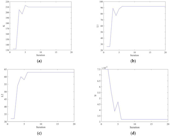 The search processes of the hyperparameters are shown in Figure 9. It can be seen that the main changes in the four hyperparameters are mainly concentrated in the third to sixth iterations. The number of iterations K finally converges to 210. The number of nodes in the first hidden layer L1 converges to 92. The number of nodes in the second hidden layer L2 converges to 63. The learning rate lr converges to 0.0032.
