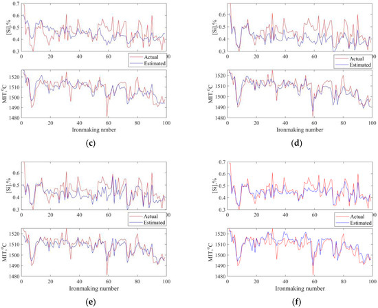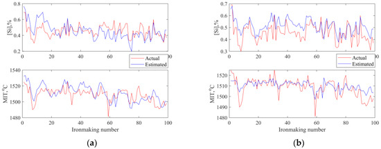 Based on the screened and processed BF operation data and the four hyperparameters in Table 5, a dataset was established, and the four different models were used to predict the MIQ parameters [Si] and MIT. The prediction results are shown in Figure 10.