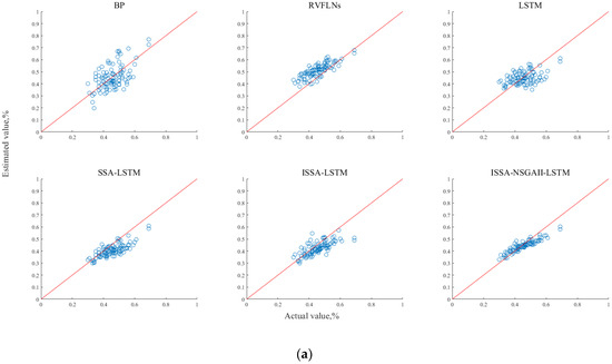 Prediction results of (a) BP; (b) RVFLNs; (c) LSTM; (d) SSA-LSTM; (e) ISSA-LSTM; (f) ISSA-NSGAII-LSTM.