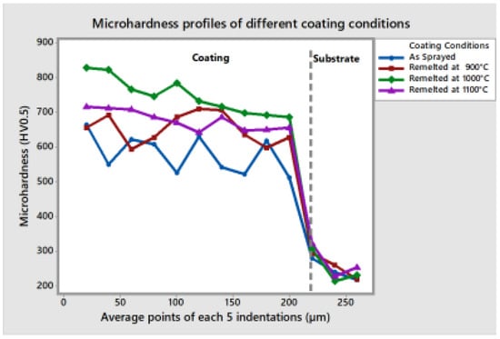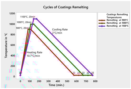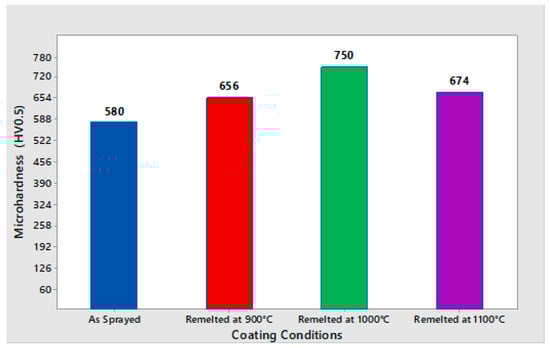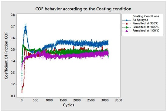 - The coefficient of friction of the remelted coating at 1100 °C was lower and more stable than the other coatings conditions, which suggested that this coating was smoother, denser, and more homogeneous than the other coatings.