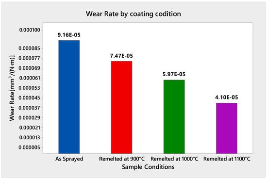 - The lost wear volume of the remelted at 1100 °C coating was 3.92 times lower than the as-sprayed coating.