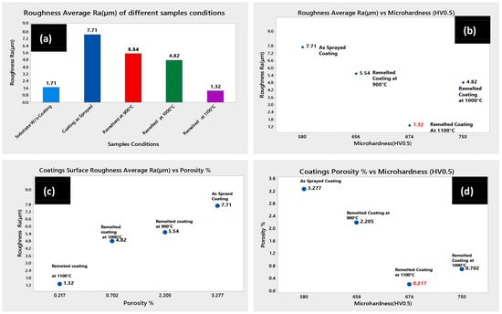 - The remelting process and temperature level drastically influence the porosity percentage of the coating. The porosity percentage of remelted coating at 1100 °C is around 15 times less than the as-sprayed coating.