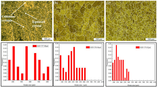 The microstructures of TiAl-based alloys with TiB2 additions of 0 wt.%, 0.45 wt.%, and 0.9 wt.% are shown in Figure 2. As presented in Figure 2a, the microstructure of the TiAl alloy without TiB2 addition shows a mix of columnar and equiaxed grains. As displayed in Figure 2b, with the addition of 0.45 wt.% TiB2 to the TiAl alloy, the microstructure is changed to a fully equiaxed grain structure. As shown in Figure 2c, the microstructure of 0.9 wt.% TiB2-TiAl alloy is similar to that of 0.45 wt.% TiB2-TiAl alloy, with a fully equiaxed grain structure but much finer grain size. The average grain size of TiAl alloy was 357 μm; by adding 0.45 wt.% and 0.9 wt.% TiB2 to TiAl, the grain size of the alloy decreased to about 236 μm and 174 μm, respectively.