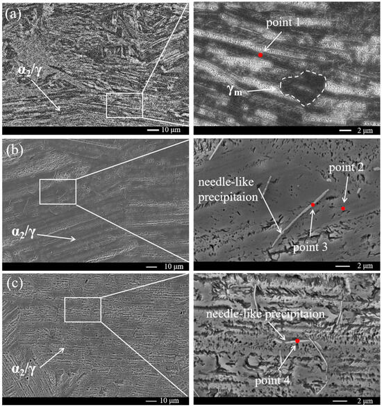 Figure 3 shows the BSE SEM images of specimens with different TiB2 additions. As can be seen, the TiAl alloy consists of (α2 + γ) lamellar and γm phases, whereas the 0.45 wt.% TiB2-TiAl alloy and 0.9 wt.% TiB2-TiAl alloy both have a fully (α2 + γ) lamellar microstructure. Meanwhile, some needle-like precipitations were also observed in specimens with TiB2 addition. Compared with the 0.45 wt.% TiB-TiAl alloy, the number of needle-like precipitations in the 0.9 wt.% TiB2-TiAl alloy is larger, with a slightly longer length. EDS point scanning was performed on these needle-like precipitations and their surrounding tissues (as shown in Table 1), and the results show that the mass fraction of B element in needle-like precipitations is significantly higher than that in surrounding tissues. Further, combined with the literature [21], it can be determined that the needle-like precipitation is boride; the specific composition of these precipitated phases needs to be further examined.