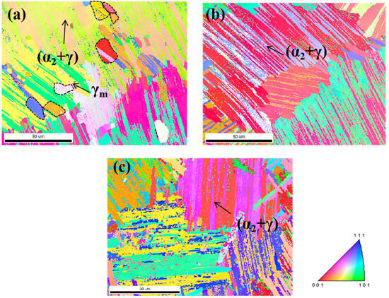 EBSD scans of TiAl alloys with different TiB2 additions: (a) pure TiAl alloy in the deposited state; (b) 0.45 wt.% TiB2-TiAl alloy; and (c) 0.9 wt.%TiB2-TiAl alloy.