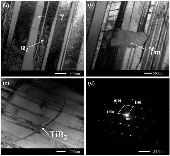 TEM images of 0.45 wt.% TiB2-TiAl partial area: (a) lamellar structure corresponding to TEM bright field images; (b) γm structure corresponding to TEM bright field images; (c) TiB2 structure corresponding to TEM bright field images (d) TiB2 structure corresponding to electron diffraction pattern.