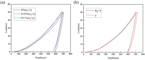 (a) Load-indentation depth curves of (α2 + γ) lamellar of the three alloys; (b) Load-indentation depth curves of (α2 + γ) lamellar and γm phases of pure TiAl alloy.
