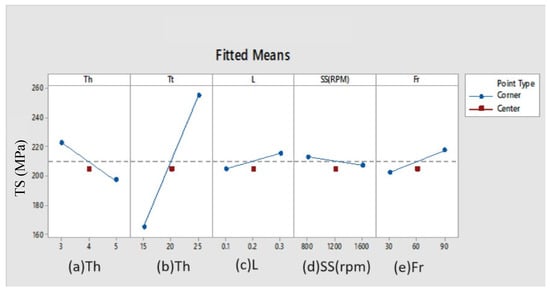 Main effect plot (TS). Note: thickness (Th), holding time (Tt), dimension (L), rotational speed (SS), and feed velocity (Fr).