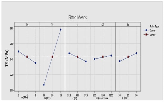 Figure 3 reveals the main effect plots, which provide valuable insights into the influence of various parameters on TS. Notably, the parameter values leading to the maximum tensile strength of 319.87 MPa are achieved with Th (5 mm), Tt (25 s), L (0.1 (97.5%) mm), SS (1600), and Fr (30 mm/min), the optimization plot for TS. In the main effect plot for TS, it is evident that TS exhibits a linear dependency on the holding time (Tt) factor, with a decreasing trend as the thickness of the aluminum sheet increases. Conversely, the lengths of the tool pin (L) and feed rate (Fr) factors positively impact the TS response. Furthermore, lower spindle speed (SS) yields a more favorable influence on TS compared to higher speeds.