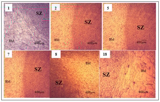The HAZ softening is observed in Figure 8, which can be explained in conjunction with the microstructure in Figure 6. Based on Figure 8, HAZ softening may be caused by the complexity of material flow divergence between the weld metal, HAZ, and base metal. The HAZ is significant because it is a region where cracking may occur and because welding might lessen its characteristics in this region. Because HAZ’s hardness is similar to that of the base metal, however, samples such as 1, 2, 5, 7, 8, and 18 exhibit neither observable cracking nor softening as grain growth was observed in BM, SZ, and TMAZ (Figure 6), which may be a result of strong heat transfer from the base metal to the area during the welding process.