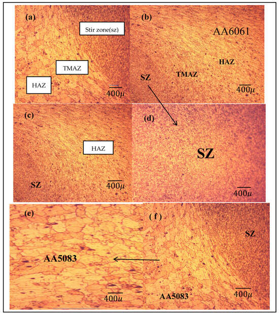 The microstructure of the welded joint. The microstructure of the optimum TS of FSW for the new tool design. (a) left-side base metal (BM) is AA5083, corresponding to the advancing side. (b) Adjacent to the advancing side is the thermo-mechanically affected zone (TMAZ). (c) Beyond the TMAZ lies the HAZ. (d) At the joint’s center is the SZ, also known as the nugget zone. (e) On the retreating side, another TMAZ is observed. (f) The right-side BM consists of AA6061 and is located on the retreating side.