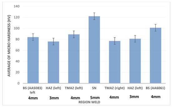Average of microhardness (HV) in the region of weld Sample 5. Note: base metal (BM), heat-affected zone (HAZ), thermo-mechanically affected Zone (TMAZ). Error bars are for 95% confidence intervals.
