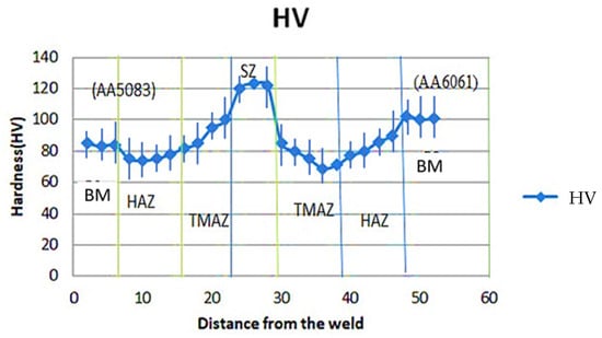 The analysis reveals a substantial disparity between four distinct zones, each playing a pivotal role in the welding process. Firstly, the base metal (BM) region represents the original materials, with AA5083 on the left and AA6061 on the right, serving as the foundation for the welding process. Surrounding the weld, the TMAZ experiences significant thermal and mechanical influence, resulting in notable changes in its hardness properties. Similarly, on both sides of the weld, the HAZ reflects the impact of heat from the welding process, causing varying levels of hardness alteration. Lastly, the SZ, or block zone, embodies the heart of the welding operation, where the two base metals are blended. The hardness characteristics of the SZ are particularly crucial, as they directly influence overall weld quality and structural integrity.