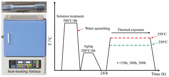 The Al-Si piston alloy utilized in the present study was cut from the upper portion of the sand-casting piston assembly. Its average chemical composition was determined using an inductively coupled plasma optical emission spectrometry (ICP-OES) (Table 1). The alloy was initially solution treated at 500 °C for 8 h (quenching was performed in water), then aged at 215 °C for 6h in ambient air, and subsequently air-cooled to achieve the T6 state. Afterward, these samples were heated at different temperatures (250 and 350 °C) for different times (150, 300, and 500 h). The samples, equipment, and schematic diagram of the heat treatment procedure are illustrated in Figure 1.