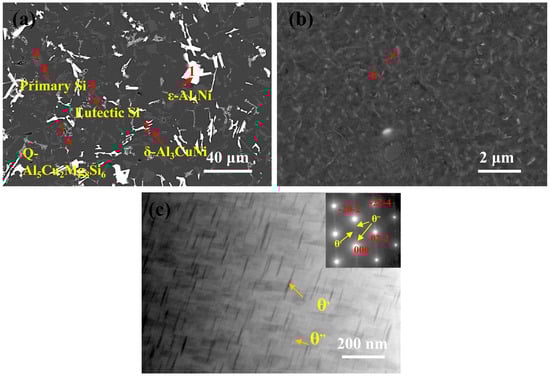 Figure 3 displays representative SEM and TEM micrographs of the Al-Si piston alloy samples in the T6 state. EDS point analyses were performed on the phase particles, as shown in Figure 3a,b. In these figures, the measurement locations are designated with numbers between 1 and 6, whereas the measurement results are presented in Table 2. Drawing upon prior research concerning the morphology and composition of intermetallic compounds in Al-Si piston alloys [24,26], the chemical formulas of each phase particle were derived. The three-dimensional network structure, comprising primary Si, eutectic Si, δ-Al3CuNi, and Q-Al5Cu2Mg8Si6 phase particles, observed in Figure 3a, served to stabilize grain boundaries during deformation, thereby enhancing the mechanical properties of the alloy. In Figure 3b, a high magnification image of the matrix microstructure in the T6 state revealed solely an Al matrix (indicated by red arrows), without the presence of tiny precipitates. Figure 3c demonstrates that the aging precipitates in the T6-treated Al-Si piston alloy samples predominantly consisted of flaky strengthening θ″ and θ′ phase particles, as confirmed by the diffraction pattern in the inset of Figure 3c. These two strengthening phase particles exhibited coherent or semi-coherent interfaces with the matrix, requiring higher stress levels to disrupt the interface between the particles and the matrix, thus reducing the likelihood of crack formation during the deformation of the alloy [32].