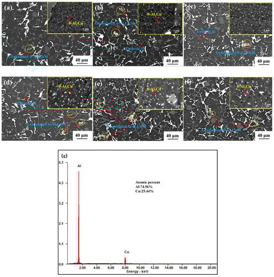 Microstructure of the Al-Si piston alloy samples after thermal exposure at (a–c) 250 and (d–f) 350 °C for (a,d) 150, (b,e) 300, and (c,f) 500 h. The insets are high-magnification SEM micrographs of the matrix, while (g) is the typical EDS spectrum taken from the θ-Al2Cu particles shown in the insets.