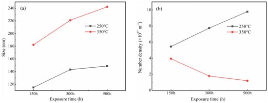 To clearly illustrate the precipitation evolution behavior of the θ-Al2Cu phase particles, the size and number density (Nv) of these particles were quantitatively measured, and the results are presented in Figure 5. It is obvious that the size of the θ-Al2Cu phase particles gradually increased with increasing exposure temperature and time. Furthermore, the size of the θ-Al2Cu particles at 350 °C was significantly larger than that at 250 °C. This was mainly due to the faster diffusion rate of Cu atoms at elevated temperatures, resulting in intensified coarsening of the θ-Al2Cu phase particles. Moreover, at 250 °C, the number density of the θ-Al2Cu phase particles increased with the exposure time, while it exhibited the opposite trend at 350 °C. This may be attributed to the dissolution of the small-sized θ-Al2Cu phase particles at higher exposure temperatures.