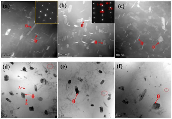 Figure 6d–f show typical TEM micrographs of the alloy samples subjected to thermal exposure at 350 °C for various durations. It is evident that the θ′ phase particles disappeared, forming a bulky θ phase compared to the alloy samples thermally exposed at 250 °C. In addition, the density of θ phase particles in the alloy gradually diminished with increasing thermal exposure time, aligning with the quantitative analyses from SEM micrographs shown in Figure 5. Furthermore, in addition to the θ phase particles in the matrix, some bulk phase particles measuring approximately 50 nm in size and point-like particles measuring around 7 nm in size were also observed, as indicated by red dashed boxes in Figure 6.