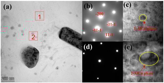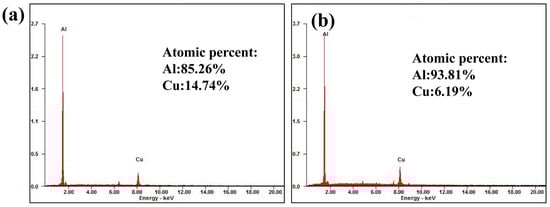 Compositional analyses of the bulk and point-like particles were conducted using EDS energy spectra of TEM, and the results are shown in Figure 7. It is evident that both phase particles were composed of Al and Cu elements, with the bulk phase particles exhibiting significantly higher Cu content compared to the point-like phase particles. Importantly, the Cu content surpassed the maximum solubility of Cu in Al (~5.65%), indicating the formation of a new AlCu phase.