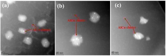 The bulk and point-like AlCu phases precipitated after thermal exposure at 350 °C were observed using the HAADF-STEM mode, and the results are shown in Figure 8. The unique Z-contrast imaging capability of the HAADF-STEM mode effectively eliminates the adverse effects of dislocations and other defects on the observation, enabling a clear reflection of the real morphology and distribution of the AlCu phase. It is obvious that with the extension of thermal exposure time, the presence of the bulk AlCu phase particles gradually decreased, while the presence of point-like AlCu phase particles increased. The distinct contrast observed in Figure 8, with the central region of the bulk AlCu phase particles appearing brighter and the edges darker, suggested a concentration gradient of Cu atoms within the bulk AlCu phase particles. Specifically, the brighter center indicated a higher Cu atomic concentration compared to the darker edges. This contrast variation likely arose due to the diffusion of Cu atoms within the bulk AlCu phase during thermal exposure. As exposure time increased, Cu atoms diffused into the surrounding matrix, leading to a gradual disappearance of the bulk AlCu phase and the formation of a smaller point-like AlCu phase. Furthermore, the relatively lower Cu content in the AlCu phase resulted in its reduced contrast in the HAADF-STEM morphology images (TEM Talos F200x, Thermo Fisher Scientific, Waltham, MA, USA). This diminished contrast made it challenging to quantitatively analyze the morphology and distribution of the AlCu phase.