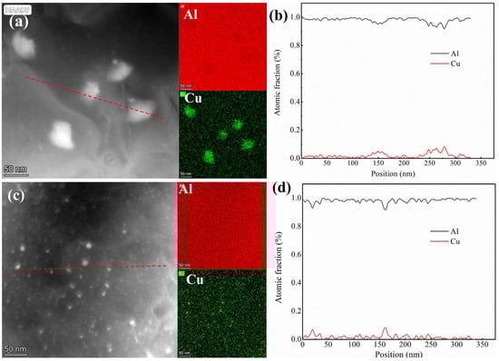 Figure 9a,b depict the HAADF-STEM morphology, elemental surface distribution, and line scanning results of the Al-Si piston alloy samples after thermal exposure at 350 °C for 150 h and 500 h, respectively. The line scanning results were conducted along the direction of the red dotted line in the HAADF-STEM morphology image. Given that the newly precipitated AlCu phase consisted solely of Al and Cu elements, only changes in Al and Cu elements were considered. In Figure 9a, the STEM-EDS elemental maps of Cu clearly revealed the presence of bulk AlCu precipitates, while the point-like AlCu phase exhibited an insufficient signal-to-noise ratio to delineate its enrichment due to its lower Cu content. Figure 9b demonstrates significant fluctuations in Cu composition across the bulk AlCu phase, whereas fluctuations were less pronounced in other regions of the matrix, primarily due to the higher Cu content of the bulk AlCu phase. Figure 9c displays the AlCu phase and its elemental plane distribution in the matrix after 500 h of thermal exposure. Although some Cu enrichment was visible, the signal-to-noise ratio was insufficient to delineate the AlCu precipitate. Figure 9d highlights obvious composition fluctuation in the Cu element, indicating the formation of Cu element segregation within the matrix. Notably, the fluctuation frequency of the Cu element in Figure 9b was much lower than that in Figure 9d. This fact suggested that more AlCu phases were formed during thermal exposure at 350 °C for 500 h compared to 150 h, which is consistent with the HAADF-STEM observation in Figure 8.