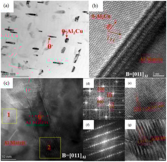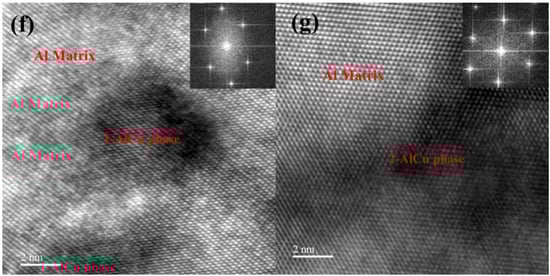 In Figure 10a, the TEM image displays the alloy sample after thermal exposure at 250 °C for 300 h, revealing numerous short rod-shaped θ′ phase particles and massive θ phase particles in the matrix. High-resolution TEM (HRTEM) analysis of the θ and θ′ phase particles in Figure 10a along the [011]Al band axis is presented in Figure 10b and c, respectively. In Figure 10b, the HRTEM analysis of the θ phase particle indicated that it lacked a specific crystal plane relationship with the Al matrix, exhibiting an incoherent interface. In Figure 10c, it is evident that the atomic arrangement of the long face of θ′ phase particle was consistent with that of the Al matrix, indicating a coherent interface. However, the atomic arrangement of its broad face significantly differed from that of the Al matrix, with periodic bright stripes apparent. The yellow dashed boxes 1 and 2 in Figure 10c represent the matrix and the broad face of the θ′ phase particle, respectively. Their corresponding fast Fourier transform (FFT) and magnified images are shown in Figure 10d and e and Figure 10f and g, respectively. The results showed that the matrix exhibited a two-dimensional lattice without distortion, indicative of an FCC structure. On the other hand, the broad surface of the θ′ phase exhibited a long-period structure composed of the orderly arrangement of stacking faults (Figure 10e,g). The generation of stacking faults was attributed to the large thermal stress generated during thermal exposure. Moreover, the generation of stacking faults is generally accompanied by dislocations, which can act as diffusion channels for Cu atoms [33]. Consequently, the stacking faults generated by the broad face of the θ′ phase facilitated the precipitation of Cu atoms on the surface of the θ′ phase and accelerated the coarsening efficiency.