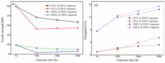 Figure 12b illustrates the effects of exposure temperature (250 and 350 °C) and exposure time (150, 300, and 500 h) on the elongation at break obtained at 25 and 350 °C. It is apparent that elongation at break gradually increased with thermal exposure temperature and time. This behavior could be attributed to the reduction in the number density of precipitated phase particles. The decrease in the number density of the precipitates increased the interparticle spacing, making it easier for dislocations to bypass, thus reducing the likelihood of stress concentration during the deformation.