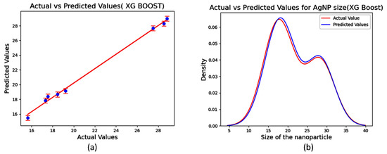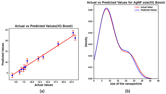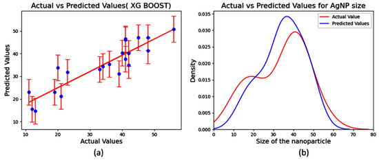 Actual versus predicted measurement of size of AgNPs for dataset 4. (a) Scatterplot with error bar; (b) Kernel density plot.