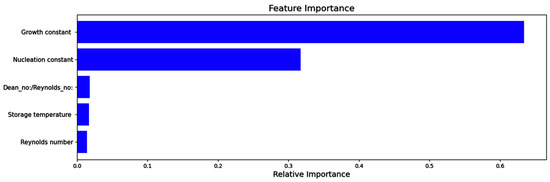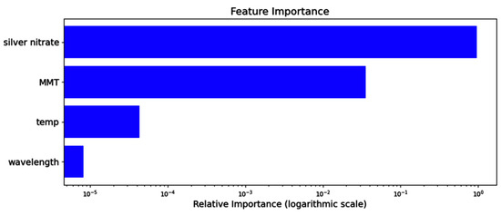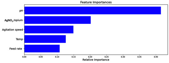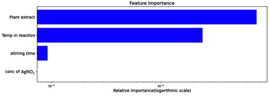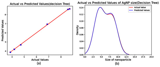Table 6 shows the performance measures of the tree-based models in which the DT model shows the best performance giving the coefficient of determination as nearly 1. Figure 12a shows the plot for the actual versus predicted values. Both visualizations in Figure 12a,b offer valuable insights into the regression model’s performance: the scatter plot directly compares the model’s predictions to the actual values, while the probability density function plot provides a deeper understanding of error distribution. Here in the scatter plot, the points lie almost on the line and the kernel density plots overlap each other, showing the decision tree models predict extremely well. The data are split in the ratio of 80:20. The model gives the best train score of 100 and test score of 99.95. The RMSE value is 0. 045. The concentration of silver nitrate is the most important feature that contributes to the prediction of size of AgNPs, giving a score of 0.964. Figure 13 shows the feature importance of the model. Figure 14 illustrates the scatter plot avoiding the most significant feature of the model. The model’s accuracy has declined, resulting in a lower R2 score of 0.65.