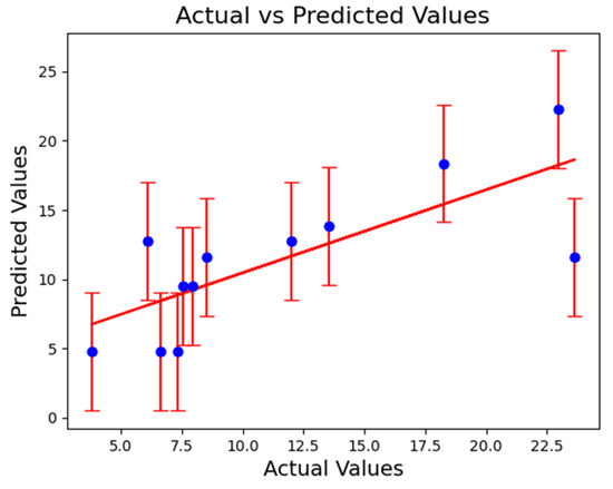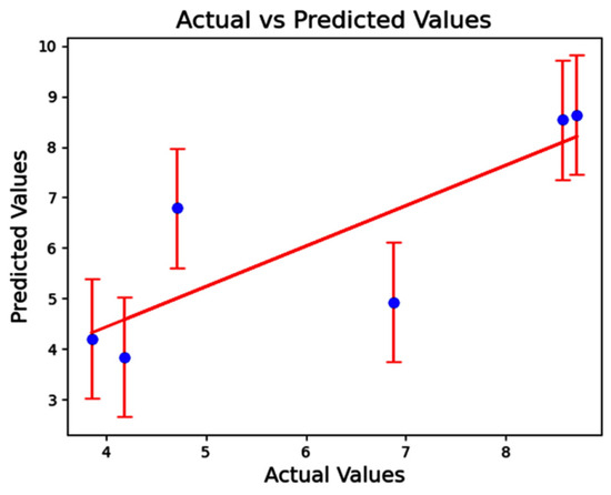 To simplify the modelling process, we have employed tree-based models in this instance. The models’ efficiency was assessed using the R2 score, MAE, and MSE. Table 4’s results demonstrate that XGBoost with learning_rate = 0.05 and max_depth = 3 outperforms the other two tree models in terms of performance. Figure 6a,b display scatter plot with error graph and kernel density plot for actual values and the predicted values, showing the performance the model. It is observed that in the scatter plot, the points are more scattered and in the plot for probability density function, it is noted that there is a deviation between the peaks of the actual value and the predicted value, which shows the predicted value has a deviation from the actual value. In this case, the size of the particles was examined using XRD, indicating that it is the grain size rather than the AgNP particle size. This could be the reason for the models’ lower score when compared to the datasets from the other three experiments. Figure 7 illustrates the relative importance of each feature and their role in AgNP size prediction. The relevance of the most important feature for this dataset is shown in Figure 8 by plotting the scatter plot. It is observed that the points are more scattered than Figure 6a where all the features are taken into consideration for modelling. The accuracy of the model reduced, giving an R2 score of 0.65 from 0.79 on avoiding the most significant feature contributing to the model prediction.