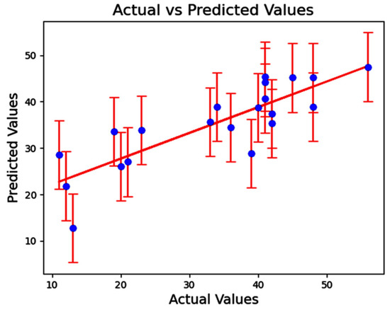 In the equations, n is the number of samples within training and testing datasets, Xi is the predicted ith value, is the actual ith value, and is the mean of true values. An improved model fit to the data is shown by R2 values that are closer to 1. Regression model accuracy describing the experimental data should be improved by smaller values of MAE and MSE. To measure the variance amongst the actual and expected outcomes for each observation, the mean square error, or MSE, is employed. The model’s predicted values and actual values are quantified by the mean absolute error (MAE), which measures the average absolute difference between them [6,39].