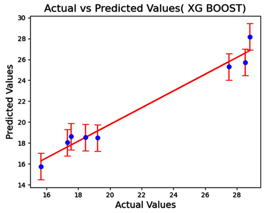In the present investigation, we used the original dataset collected from the literature [18], which consisted of 20 samples that were replicated three times for a total of 60 datasets. All three models employed the same dataset, and the more accurate predictive model is obtained with appropriate hyperparameter optimization. The best performance is showcased by XGBoost model with learning_rate = 0.15, max_depth = 4, and gamma = 0.2, which results in the highest coefficient of determination of 0.973 and the lowest MSE and MAE of 1.09 and 0.73, respectively. Figure 3a compares the actual and the predicted values using the scatter plot. In the scatter plot, the points lie close to the best fit line with less deviation, indicating that it is a good model, and by plotting the probability density function for actual and predicted values, as in Figure 3b, it is observed that the peak of the actual and predicted values matches, which emphasizes the better predictability of the model. The results of the evaluation matrix for all three models are shown in Table 3.