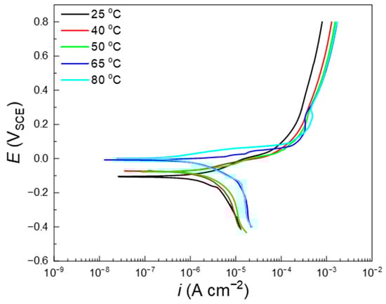 Potentiodynamic polarization curves for the specimens in synthetic tap water at different temperatures.