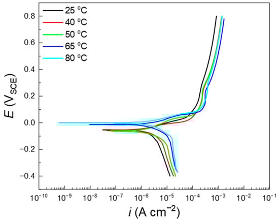 When the solution temperature increases from 25 to 65 °C, the cathodic current density at −0.3 VSCE enlarges about 1.1 times. It is well known that a higher temperature may enhance the activation of corrosion reactions and the diffusion of dissolved oxygen [7,9,26]. These may facilitate the oxidation reaction of copper and then accelerate its corrosion in synthetic tap water. However, when the temperature reaches 80 °C, the cathodic current density slightly decreases to 16.8 μA cm−2. This can be mainly attributed to the significant reduction in oxygen content in the solution. It is reported that the dissolved oxygen content linearly changes from about 8.0 to 3.5 mg L−1 with the increase in temperature from 25 to 80 °C [27], which is unfavorable for the cathodic reaction of the corrosion process.