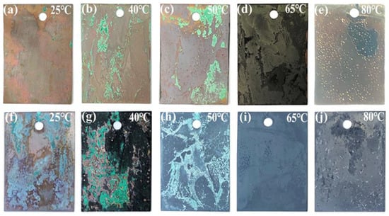Figure 3 shows macroscopic images of the specimen surfaces immersed in synthetic tap water with and without NaClO at different temperatures for 70 d. As shown in Figure 3a–e for synthetic tap water without NaClO, all specimen surfaces almost have no metallic luster after the immersion corrosion. For the solutions at 25 °C to 50 °C, there are mainly reddish brown and green corrosion products formed on the surfaces. The green corrosion products significantly grow with the increase in temperature. For the immersion at 65 and 80 °C, the specimen surfaces are completely covered by the brownish black corrosion products.