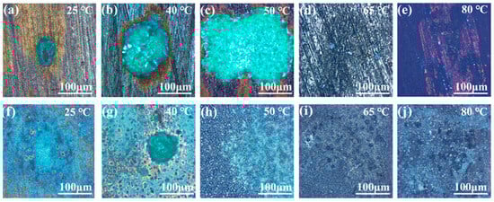 Figure 4 gives the local optical morphologies of pits on the specimens immersed in the two solutions at different temperatures for 70 d. In synthetic tap water without NaClO, as shown in Figure 4a–e, the pits are covered with green corrosion products. The pits significantly enlarge with the change in temperature from 25 to 50 °C, but are difficult to be observed due to their small sizes for temperatures at 65 °C and 80 °C. In synthetic tap water with NaClO, as shown in Figure 4f–j, the green corrosion products appear above the big pits on the specimen surfaces for temperatures at 25 °C and 40 °C. There are also many small pits. Under the conditions of 50 °C to 80 °C, only very small corrosion pits can be observed on the black specimen surfaces.