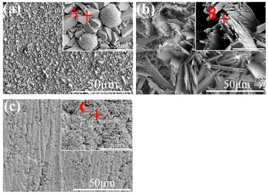 Figure 5 gives typical SEM images of corrosion products on the specimen surfaces after the immersion test in synthetic tap water at 50 and 65 °C. For the specimen surface at 50 °C, the reddish brown area displays a relative corrosion product layer in Figure 5a, which is mainly composed of blocky and spherical product particles [23]. The green area shows a relatively loose and porous product layer in Figure 5b, which mainly consists of lamellar flakes. The corrosion products on the specimen surfaces at 25 and 40 °C are basically similar to those at 50 °C. For the specimen at 65 °C, the black corrosion product layer exhibits acicular characteristics in Figure 5c. The corrosion products on the specimen at 80 °C are similar to those at 65 °C.