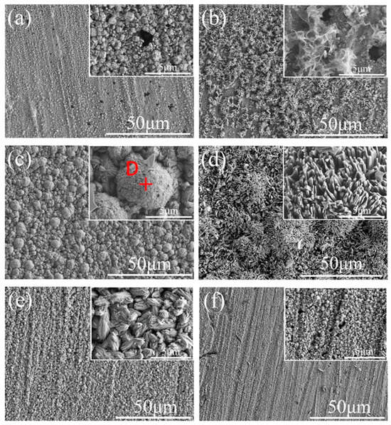 Figure 6 gives typical SEM images of corrosion products on the specimen surfaces after the immersion test in synthetic tap water with 3 ppm NaClO at different temperatures. Figure 6a,b show that the reddish brown and green corrosion products exhibit granular and filamentous characteristics, respectively, on the specimen surface at 40 °C. There are some micropores in the corrosion product layer. The corrosion products on the specimen surface at 25 °C are basically similar to those at 40 °C. Figure 6c,d show that the black and green corrosion products are irregularly spherical and lath-like on the specimen surface at 50 °C. Figure 6e,f show that the black corrosion products exhibit spindle-like and granular characteristics on the specimen surfaces at 65 and 80 °C, respectively.