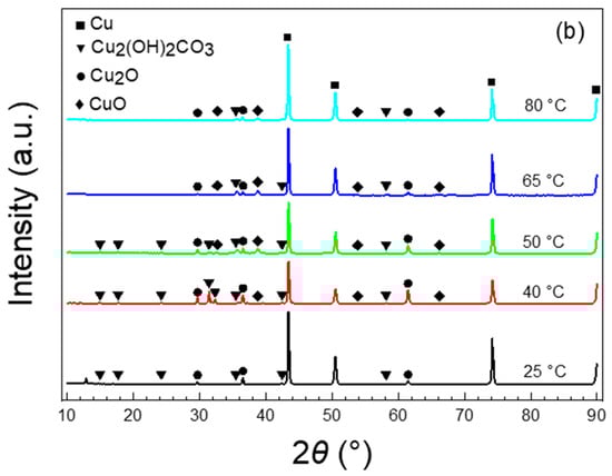 Figure 3 and Figure 7 indicate that the predominant corrosion products change from Cu2O and Cu2(OH)2CO3 to CuO when the solution temperature is higher than 50 °C. This is consistent with the thermodynamic calculation in the literature [30]. CuO is more protective than Cu2(OH)2CO3 to the copper matrix [31,32], which may be mainly responsible for the left shift of anodic polarization curves at 65 and 80 °C in Figure 1. It is clear that the formation of CuO inhibits the anodic process. As shown in Figure 5, the loose Cu2(OH)2CO3 layer formed on the specimen surface under temperatures below 50 °C and significantly reduced at higher temperatures. According to Figure 4 and the literature [6,33,34,35], the corrosion under the green product Cu2(OH)2CO3 is prone to produce pits on the copper surface at lower temperatures. During the long-term immersion process, the electrochemical corrosion cell with a small anode and large cathode feature may form along the pits on the specimen surface, which can promote anodic dissolution and the growth of the pits [36,37].