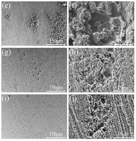 Typical SEM morphologies of pits on the pickled specimen surfaces after the immersion test in synthetic tap water with 3 ppm NaClO at different temperatures: (a,b) 25 °C, (c,d) 40 °C, (e,f) 50 °C, (g,h) 65 °C, and (i,j) 80 °C.