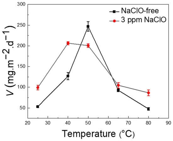 Corrosion rate of the specimens immersed in synthetic tap water without and with 3 ppm NaClO at different temperatures.