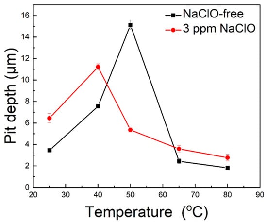 Average pit depth for the specimens after the immersion tests in synthetic tap water without and with 3 ppm NaClO at different temperatures.
