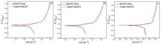 Comparisons for the potentiodynamic polarization curves in synthetic tap water without and with 3 ppm NaClO at different temperatures: (a) 25 °C, (b) 50 °C, and (c) 80 °C.