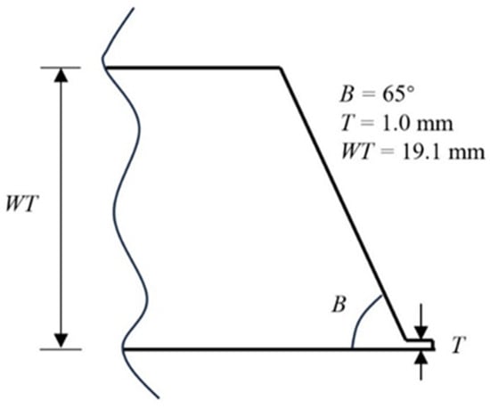 The base material was X65 pipeline steel, with dimensions of diameter (Φ) 355 mm × thickness 19.1 mm. The filling material was ER80S-G solid wire (ESAB Corporation, North Bethesda, MD, United States), with a dimension of Φ1.0 mm. The main chemical composition of the base material and filling material is shown in Table 1. The mechanical properties of the base material are shown in Table 2. Circumferential butt joints, with a V-shaped groove, were prepared. During welding, gas metal arc welding (GMAW) was used for root, filling, and cap passes. The groove parameters are shown in Figure 1, with a groove angle of 50°, and a root face height of 1.0 mm.