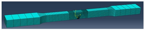 In the field output request of the Create Step dialog box, NFORC, i.e., the node force caused by element stress, was selected as the field output for the subsequent structural stress calculation. In the Load Create step, the load was applied by fixing one end of the specimen and adding periodic dynamic loads to the other end. The meshing of the model followed the rule that the grids (C3D8) were sparse at both ends, and were dense in the middle. In the direction of the x-axis, the grid widths for the weld joint, the area near the weld joint, the transition area, and the area away from the weld joint were 1 mm, 2 mm, 4 mm, and 16 mm, respectively. The grid width in the direction of the y-axis was 1.2 mm. At the same time, considering that the stress calculation was calculated in 2D mode, the grid division was not conducted in the direction of z-axis. The meshing result is shown in Figure 3.