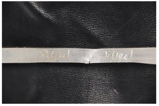 To verify the correspondence between the stress concentration factor kj and the fatigue performance of the weld joints, fatigue tests were conducted on samples of GMAW (5G) without backing. The fatigue load was loaded axially, with a static load of 400.0 MPa and a dynamic load of 175.0 MPa. The main standards used in the experiment were DEP-37.81.40.31-Gen: 2013 [], BS EN ISO 5817: 2014 [], BS EN ISO 6520-1: 2007 [], etc. The experimental results are shown in Table 7.