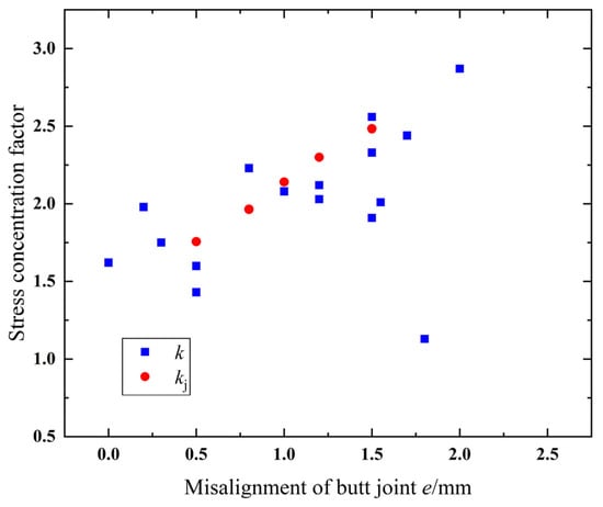 By comparing the structural stress concentration factor kj, obtained from the finite element simulation of GMAW (5G, i.e., all position for pipe) without backing, with the total stress concentration factor k, as shown in Figure 6, it can be seen that the distributions of kj and k were roughly similar, and that most values of k were below those of kj under the same misalignment condition. It is noticed that when the misalignment was small (less than 0.5 mm), k was larger than kj. This was because, when the material properties were set, the material properties of the heat affected zone were set to be the same as those of the base material. However, in reality, the microstructure of the heat affected zone undergoes drastic changes, and its material properties may differ slightly from those of the base material. Thus, when the misalignment was small, the structural changes in the heat affected zone significantly affected the stress concentration coefficient, making k larger than kj. However, when the misalignment was large (more than 0.5 mm), it played a dominant role in the stress concentration coefficient, and the influence of structural changes in the heat affected zone was reduced, so the distribution rules of k and kj tended to be consistent. In the actual welding process, due to the limited fitting-up accuracy of large pipelines, the misalignment is usually more than 0.5 mm, so the impact of this error is minimal. Therefore, this non-destructive method of analysis using the finite element method can be used to calculate the stress concentration factor, and the subsequent fatigue performance prediction can be analyzed through kj with a larger safety coefficient.