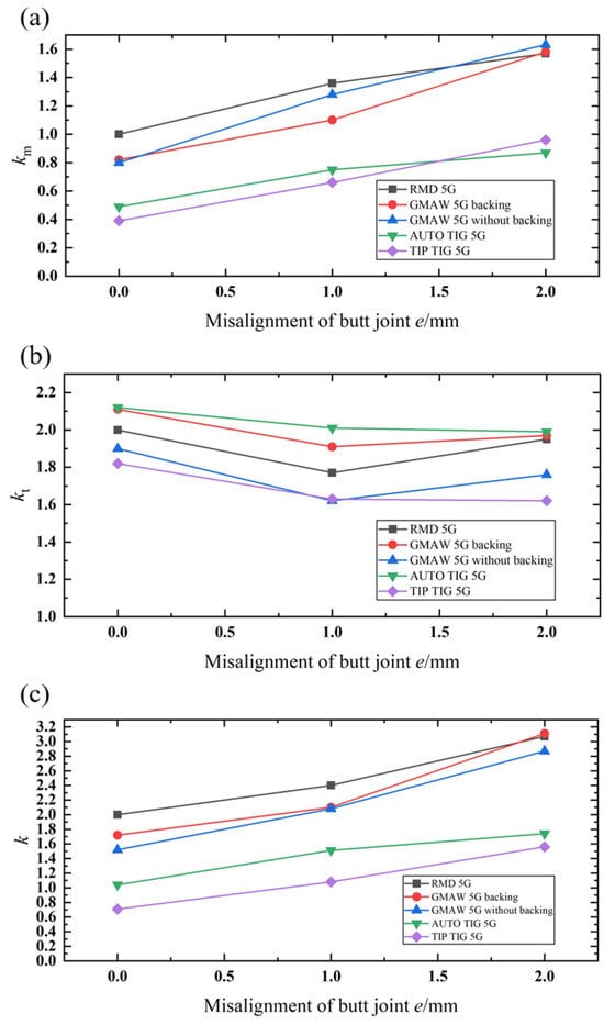 To analyze the effects of different misalignments on km and kt, experiments were conducted on five welding processes at 5G position (as listed in Table 6). For each welding process, calculations were performed on butt joints with three misalignment conditions of 0 mm, 1.0 mm, and 2.0 mm, respectively. The calculation results are shown in Figure 7.