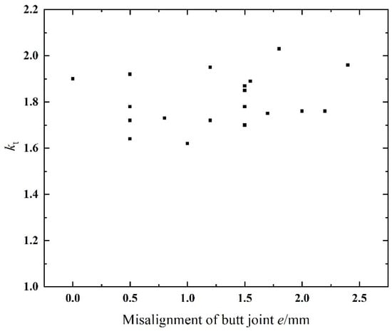 From the calculation results in Figure 7, the stress concentration factor km gradually increased with an increase in misalignment, while the equivalent notch stress concentration factor kt, caused by weld shape, did not change significantly with the increase in misalignment, and the kt of each welding processes fluctuated steadily within a small range. The notch stress concentration factor kt is used to describe the stress distribution near the notch when there is a notch in the stress field, mainly influenced by factors such as notch size, shape, and material properties. More welding tests were performed on GMAW (5G) without backing, and the fluctuation range of kt was 1.6–2.0 (as shown in Figure 8). The equivalent notches generated by misalignments in these tests did not change with the increase in misalignment. This is because the misalignment was small, while the pipe wall thickness was large. During welding, the molten metal was able to smoothly connect the misalignment under the action of surface tension, forming a smooth equivalent notch. Thus, the impact of misalignment on the equivalent notch was not significant. At the same time, the misalignments of RMD (regulated metal deposition) (5G), GMAW (5G) with backing, and GMAW (5G) without backing had a significant impact on km (Figure 7a); the misalignments of AUTO TIG (tungsten inert gas) (5G) and AUTO TIP TIG (technologie ingenieur plasch TIG) (5G) had a relatively small impact on km (Figure 7a). This is because the heat inputs of TIG and TIP TIG were relatively small, and the welding deformation and residual stress caused by misalignment were also relatively small. High heat input leads to a rapid heating and cooling of the weld joint and its surrounding area, resulting in increased deformation of the weld joint and its surrounding area, thereby increasing the stress concentration factor. This indicates that the stress concentration factor can be significantly reduced if TIG or TIP TIG welding processes are employed, suggesting an improved fatigue performance.